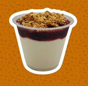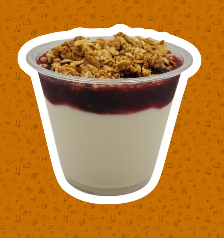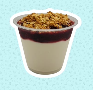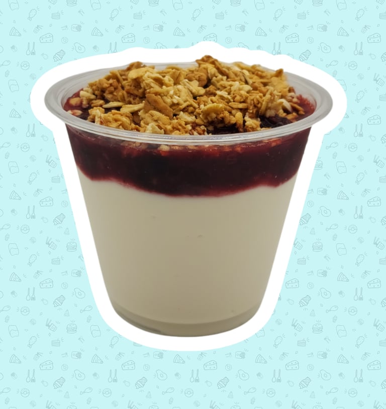 Plain or Vanilla greek yogurt base, with mixed berries and granola toppings.