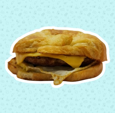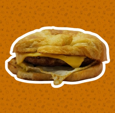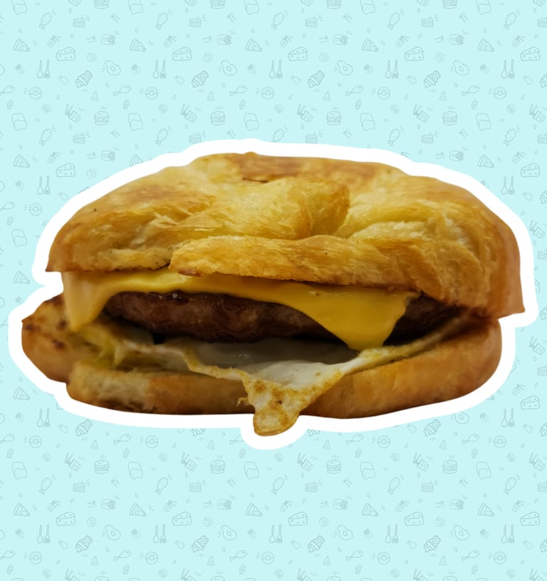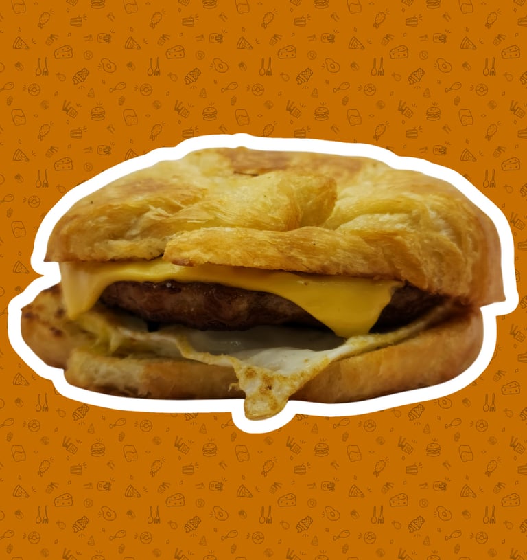 Egg, breakfast sausage, and American cheese on toasted croissant bread.