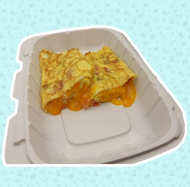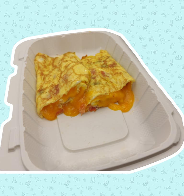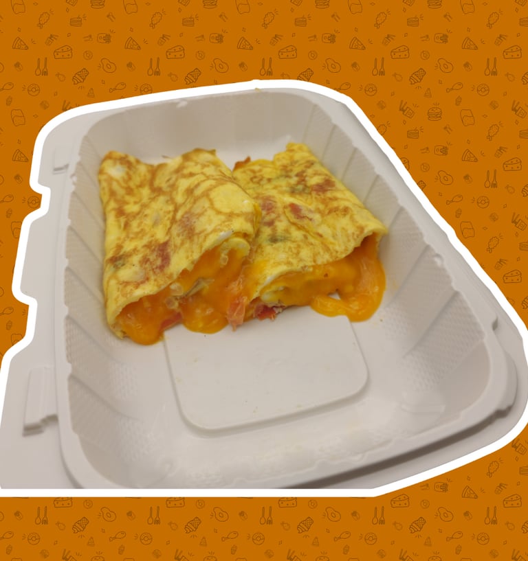 Eggs, cheddar cheese, sautéed tomato, onion, and jalapeño