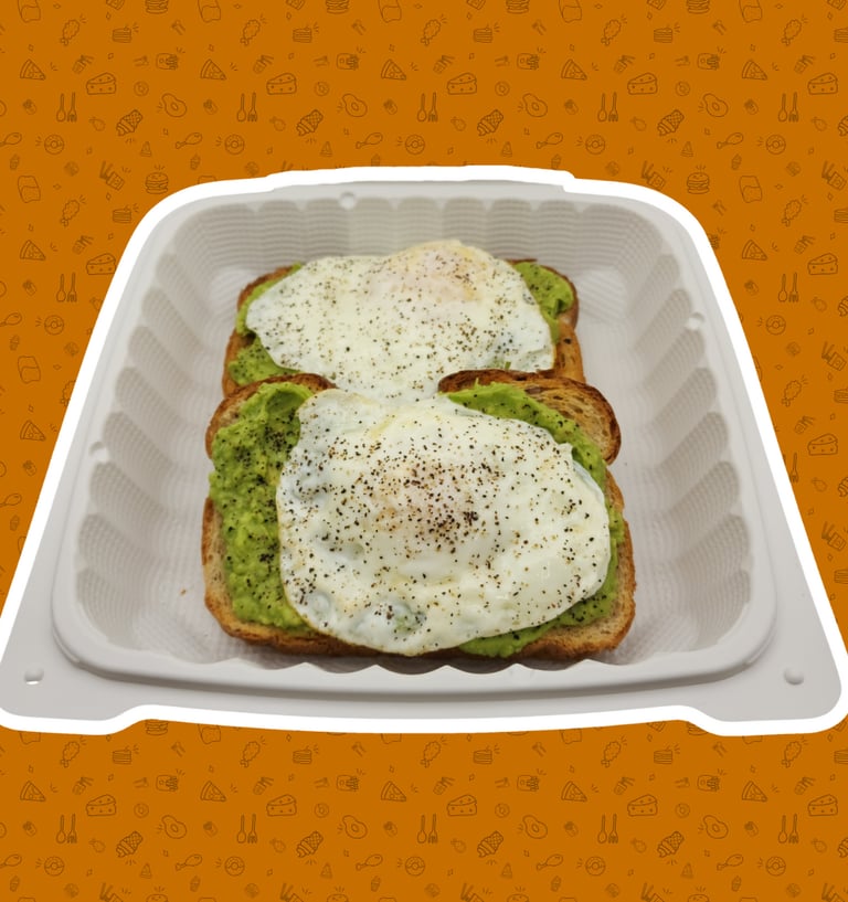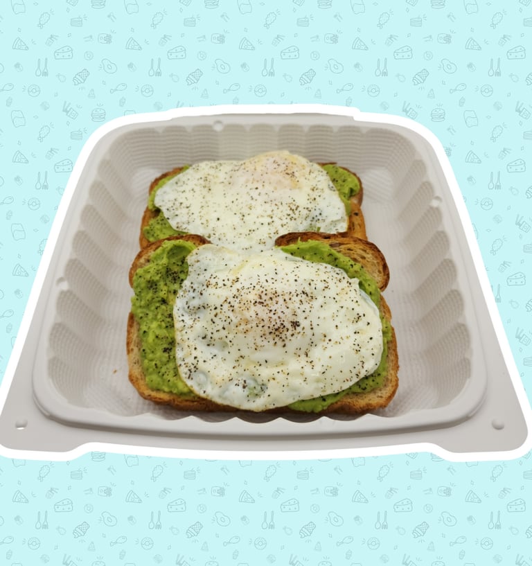 Two slices of wheat toast with a hearty avocado spread, and two over medium eggs topped with salt and pepper.