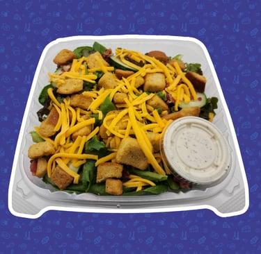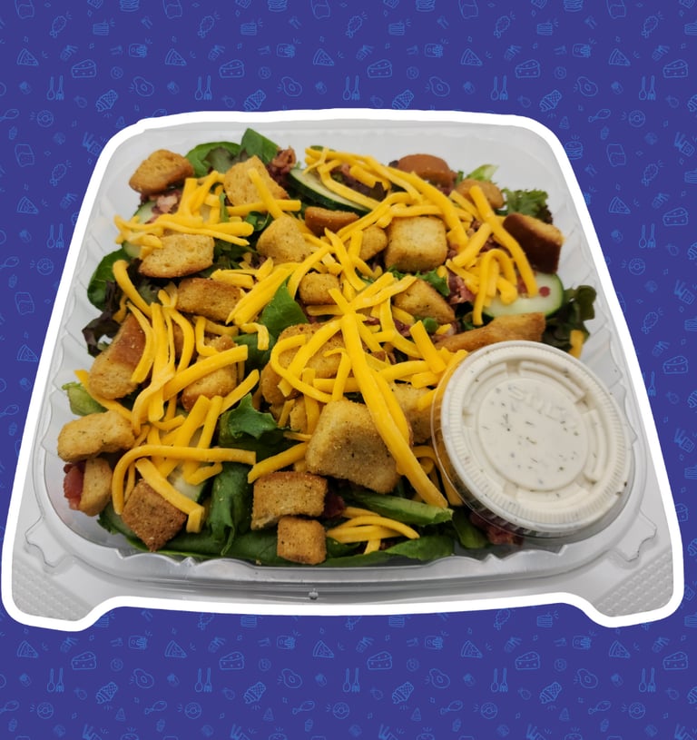 Spring mix with cheddar cheese, cucumber, bacon bits, croutons, and ranch dressing.